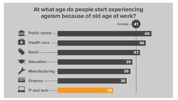 Laut einer Umfrage von CWJobs, einer in Großbritannien ansässigen Rekrutierungswebsite für Technologieunternehmen, an 2.000 Arbeitnehmer und 250 Personen, die in der Technologie- und IT-Branche arbeiten, haben 41 % der Arbeitnehmer in der IT- und Technologiebranche Altersdiskriminierung am Arbeitsplatz erlebt. Die Umfrage zeigt auch, dass nur 27 % der Arbeitnehmer in den anderen Branchen Erfahrungen mit Altersdiskriminierung gemacht haben.