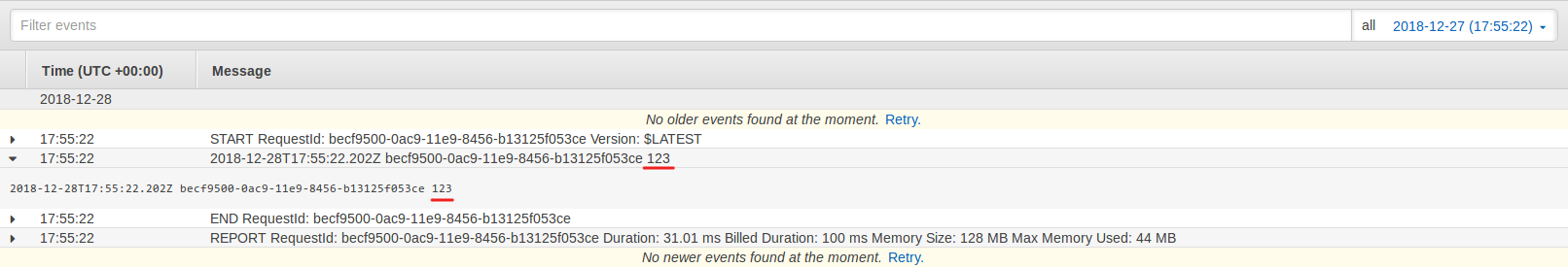 For example, if we replace the // TODO implement string in the code with console.log(123); and run the test, we will be able to see our value in the CloudWatch logs.