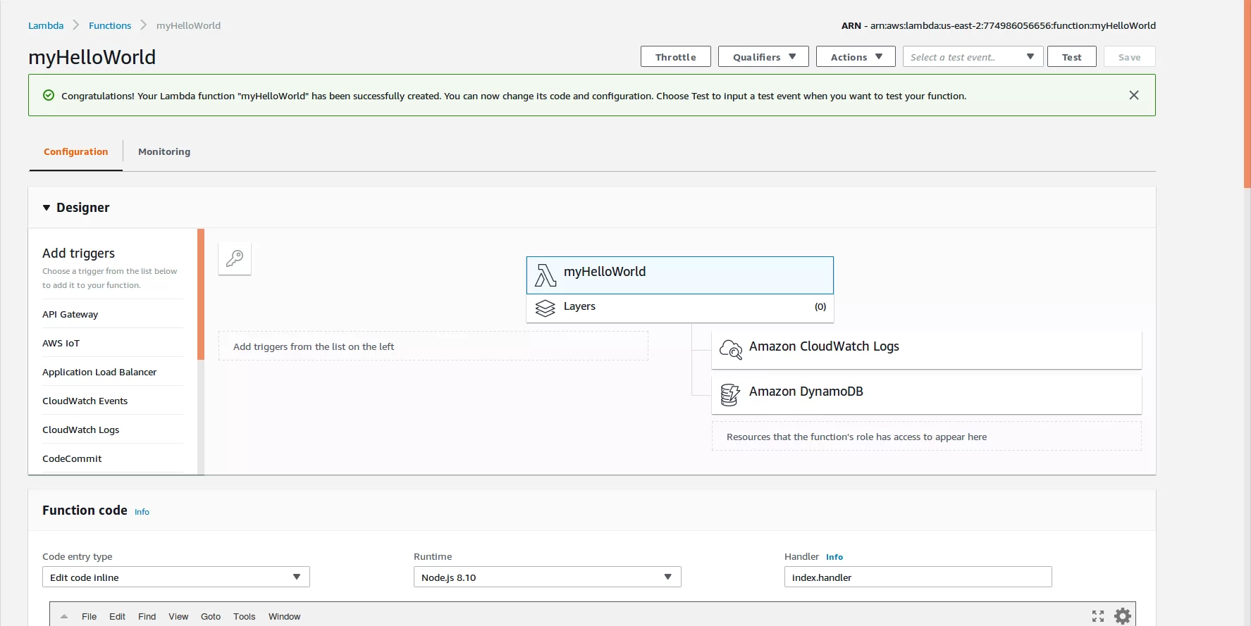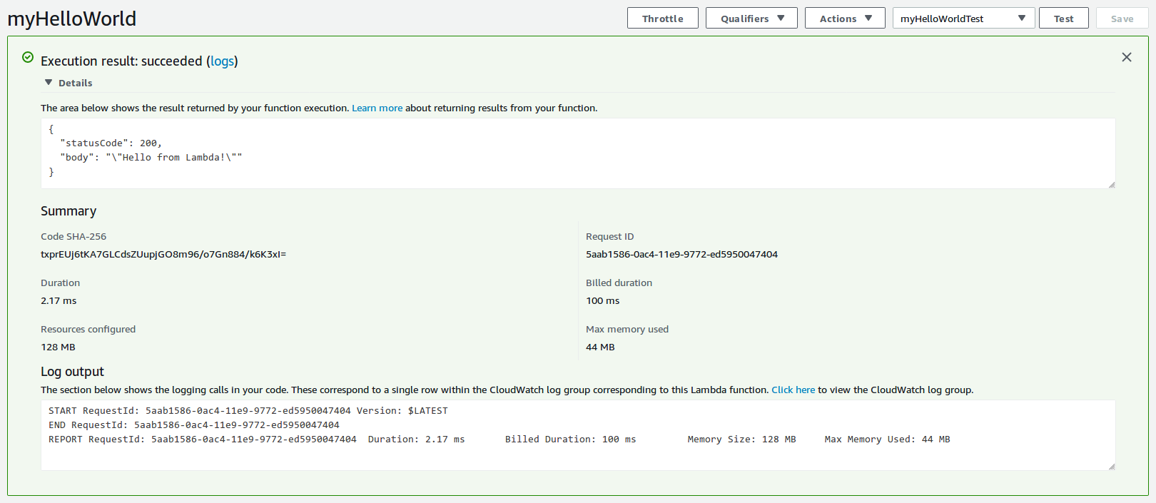 When testing, logs are displayed directly in the test results and the built-in editor. In addition, for each function call including testing, logs are recorded in the CloudWatch service. For our function a separate group /aws/lambda/myHelloWorld will be created in which all logs will be stored.
