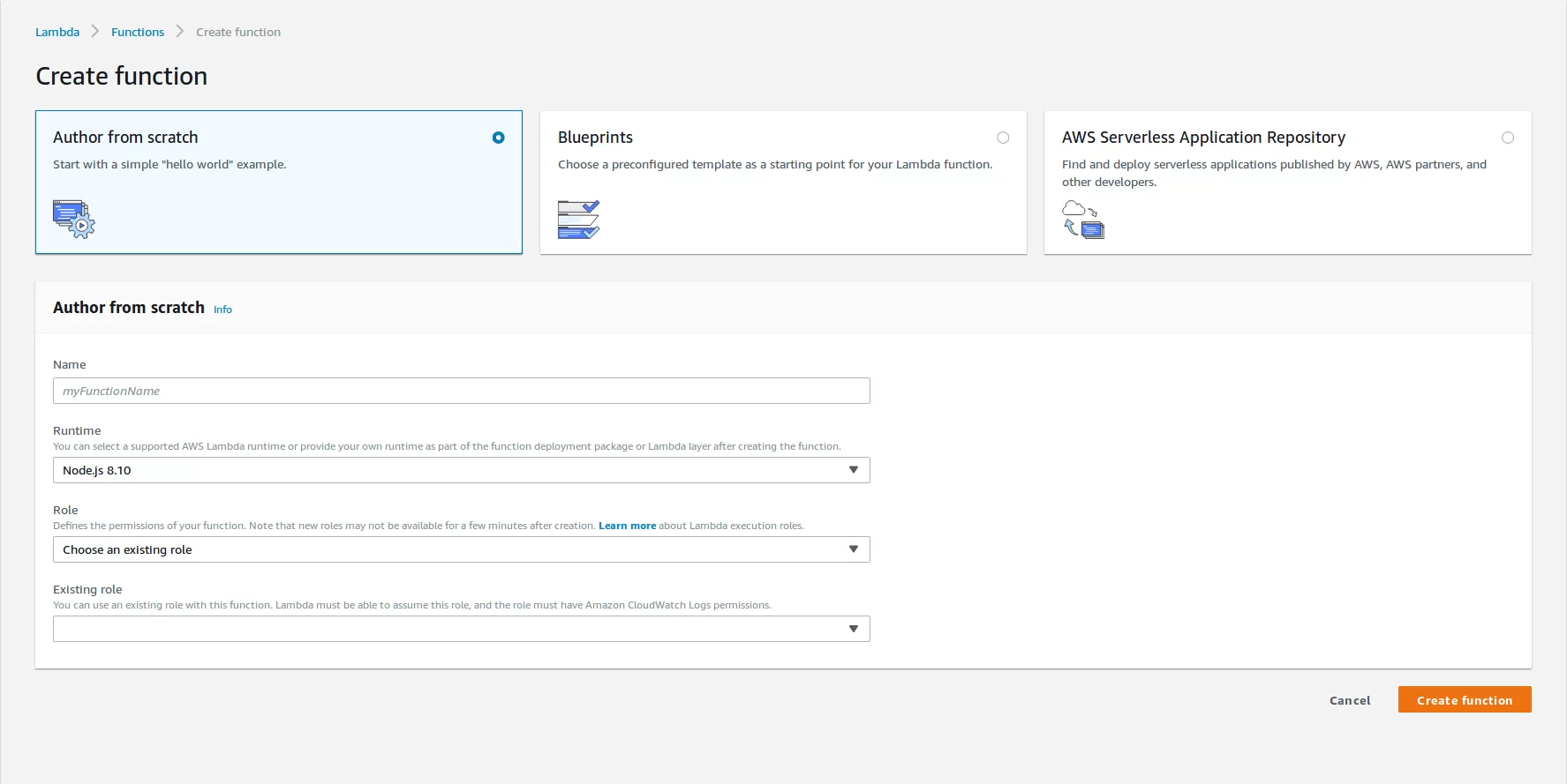 Here you can create a function from scratch (“Author from scratch”) or select from the set of available “Blueprints” templates. In this article we will consider only the first option. Since this option is already selected by default, let’s fill in the form of 4 fields :
