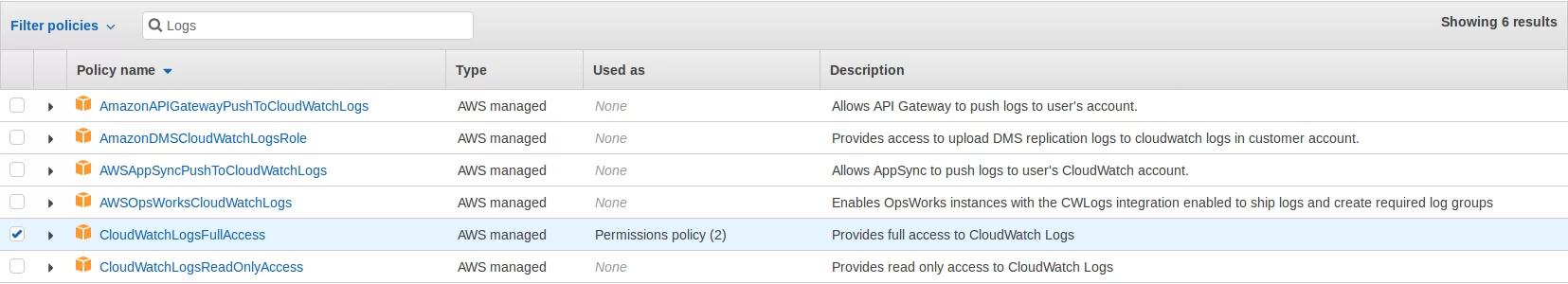 By default, our created role does not have all rights to write logs. What leads to the loss of logs made by console.log(). Therefore, we will add a full access to the CloudWatch service. To make this happen, we will need the IAM console. To get there quickly, click on the “Amazon CloudWatch Logs” block, and in the block that appears below, click on the “Manage these permissions” link.
