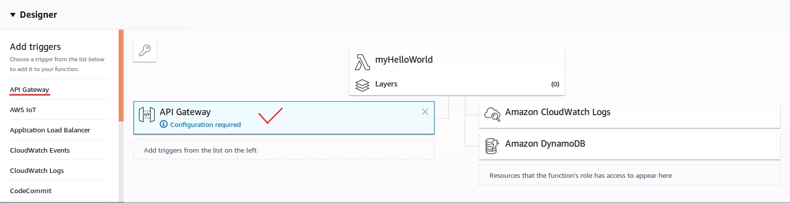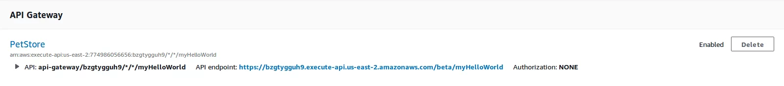Now all it takes is to check the result by clicking on the method link, which looks something like this https://bzgtygguh9.execute-api.us-east-2.amazonaws.com/beta/myHelloWorld