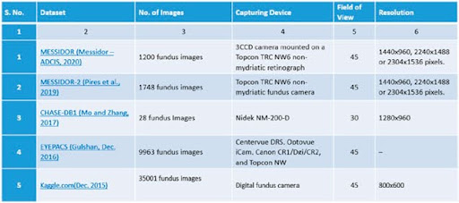 Das erste Problem, das bei der Lösung dieser technischen Aufgabe gelöst werden musste, war die Frage, woher man eine Trainingsstichprobe bekommen sollte. Im Zuge der Untersuchung dieses Problems wurden viele Quellen auf die Verfügbarkeit von fertigen Datensätzen mit Fundusbildern analysiert. Eine kurze Übersicht über im Internet unter einer freien Lizenz verteilte fertige Datensätze ist in der Tabelle dargestellt: