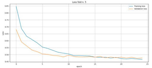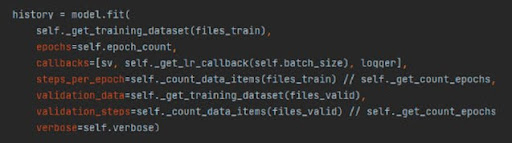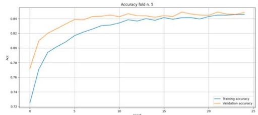 Das Training erfolgt in 5 Phasen (Folds). In jeder Phase werden die Daten zufällig gemischt. Ein Fünftel der Daten wird zur Überprüfung der Trainingsgenauigkeit verwendet (Validierungssatz in den Begriffen von TensorFlow), die restlichen Daten werden zum Trainieren des Modells verwendet. Somit können sich die Trainingsdaten von Phase zu Phase unterscheiden, was es ermöglicht, die Gewichtungskoeffizienten mit den besten Ergebnissen auszuwählen.
