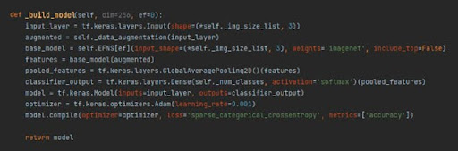 Der nächste wichtige Schritt war der Aufbau eines Modells basierend auf dem oben genannten EfficientNet-Netzwerk. Schauen wir uns Schritt für Schritt an, was in jeder Zeile passiert: