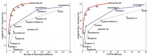 Die Autoren des Artikels [EfficientNet: Rethinking Model Scaling for Convolutional Neural Networks] schlagen eine neue zusammengesetzte Skalierungsmethode vor, die Tiefe/Breite/Auflösung mit festen Proportionen zwischen ihnen gleichmäßig skaliert. Als Ergebnis erhalten die Autoren eine neue Klasse von Modellen, die EfficientNet genannt wird und bereits die optimalsten Startgewichtungskoeffizienten enthält. Es gibt mehrere Untergruppen dieser Architekturen eines bestimmten Netzwerks von B0 bis B7, je nach erforderlicher Genauigkeit. Das Funktionsschema dieser Netzwerke wird im Vergleich zu anderen Netzwerken in der Abbildung gezeigt. Dieses Netzwerk wurde zur Lösung der Aufgabe ausgewählt. Der Vergleich von EfficientNet mit anderen Netzwerken ist auf dem Bild zu sehen: