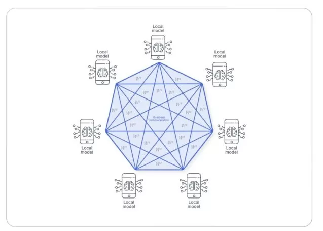 Dezentralisiertes föderiertes Lernen erfordert keinen zentralen Server. Stattdessen werden Modell-Updates direkt zwischen miteinander verbundenen Edge-Geräten ausgetauscht. Das endgültige Modell wird durch die Aggregation der lokalen Updates dieser Geräte erhalten.