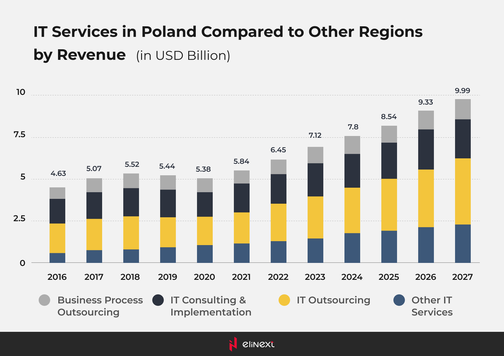 Wie Statista betont, wird der Umsatz auf dem polnischen IT-Dienstleistungsmarkt im Jahr 2023 voraussichtlich 7,12 Milliarden US-Dollar erreichen, wovon das Segment IT-Outsourcing 2,56 Milliarden US-Dollar ausmacht. Der Umsatz wird mit einer CAGR von 8,85 % weiter wachsen und bis 2027 9,99 Milliarden US-Dollar erreichen.