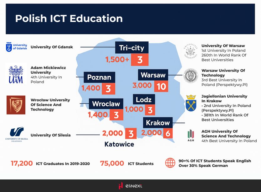 Laut einem Bericht von N-iX verfügt Polen über einen beeindruckenden Talentpool von über 450.000 IKT-Fachkräften, die jährlich mehr als 17.000 IKT-Absolventen hervorbringen: