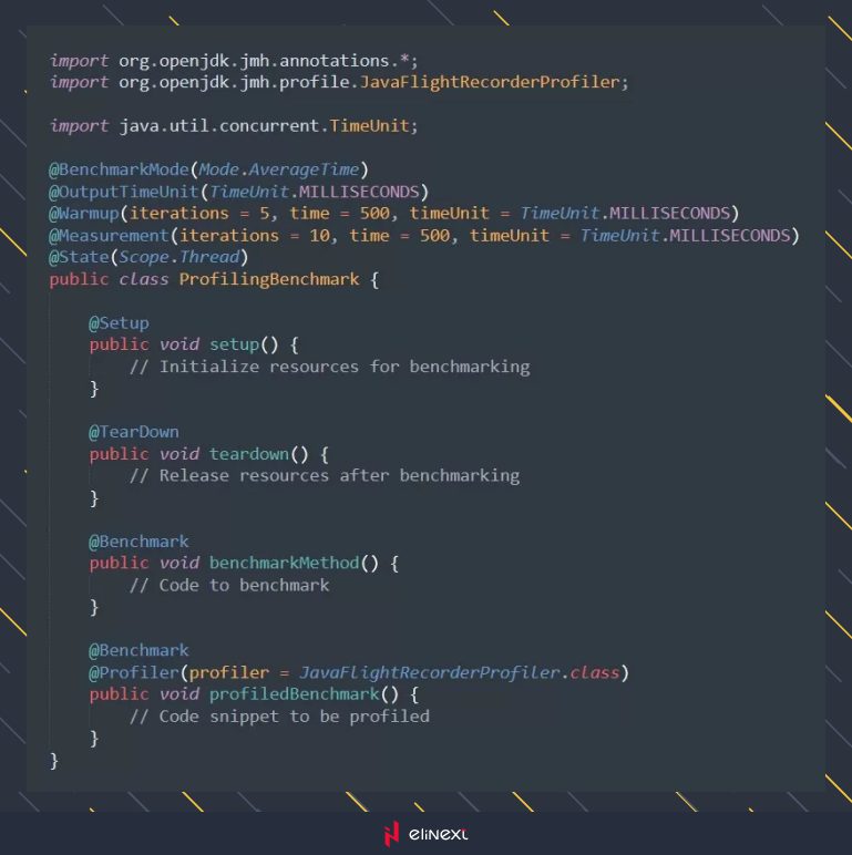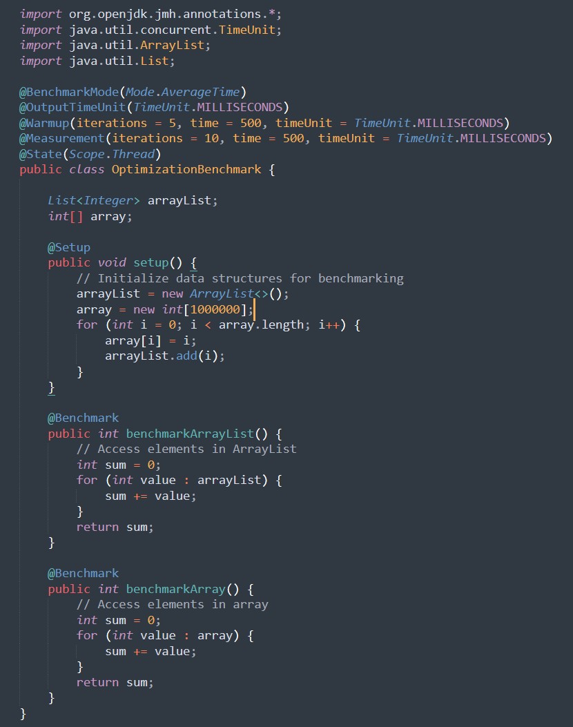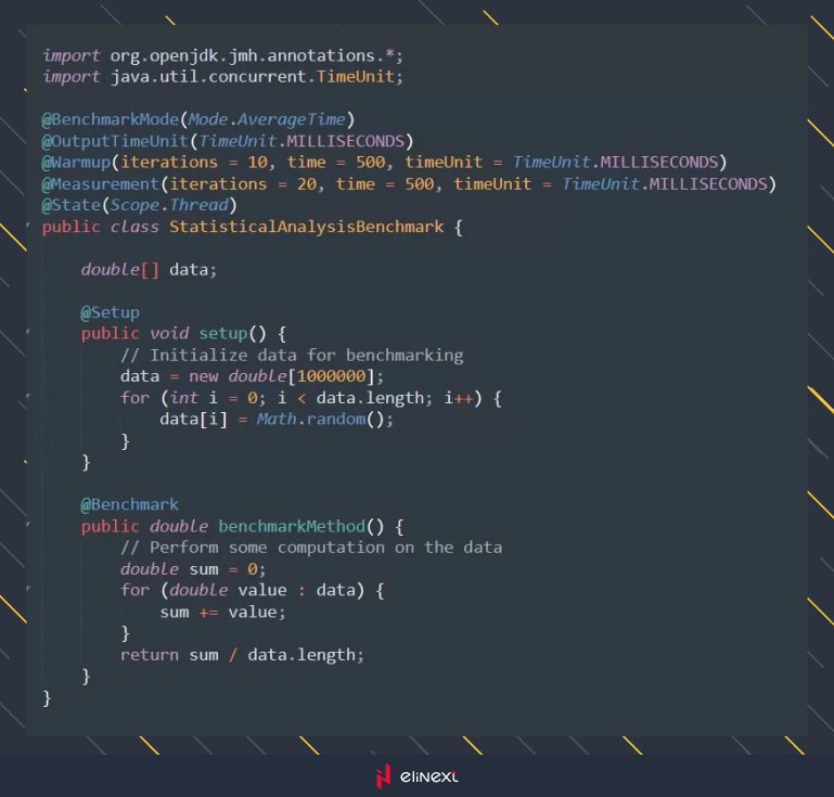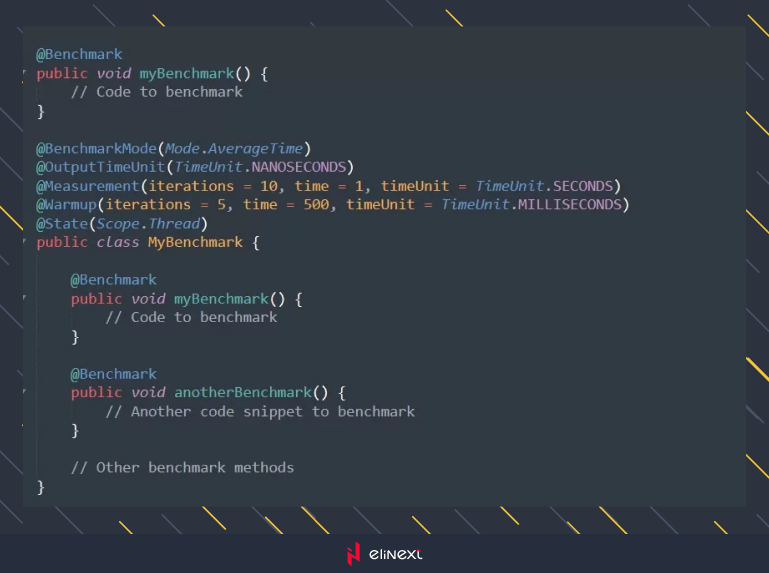 - Feinabstimmung der Steuerung: JMH bietet eine fein abgestimmte Steuerung über Benchmarking-Parameter, die es Entwicklern ermöglicht, den Benchmarking-Prozess entsprechend ihren spezifischen Anforderungen anzupassen. Dazu gehört die Konfiguration der Anzahl von Warm-up-Iterationen, Messungs-Iterationen und der Anzahl von parallelen Forks, was die Flexibilität bietet, Tests an unterschiedliche Anwendungsfälle anzupassen.