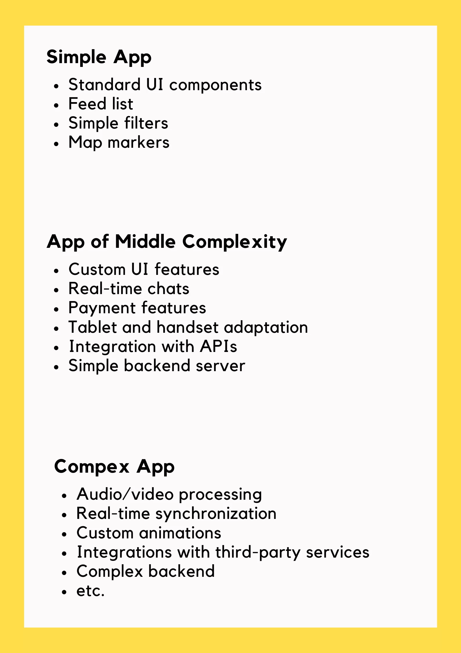 Each of these types of apps also differs in terms of the time needed for development. In average, simple apps take from 300 to 600 development hours, apps of middle complexity — from 600 – 800 hours, complex apps — from 1000 – 1300 hours.