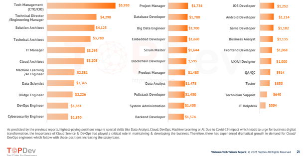 Die durchschnittlichen Gehälter vietnamesischer Entwickler liegen deutlich unter denen ihrer globalen Kollegen. Zum Beispiel verdient ein Entwickler in den USA im April 2024 durchschnittlich 7.475 US-Dollar pro Monat, was zwölfmal höher ist als das durchschnittliche monatliche Gehalt eines vietnamesischen Programmierers.