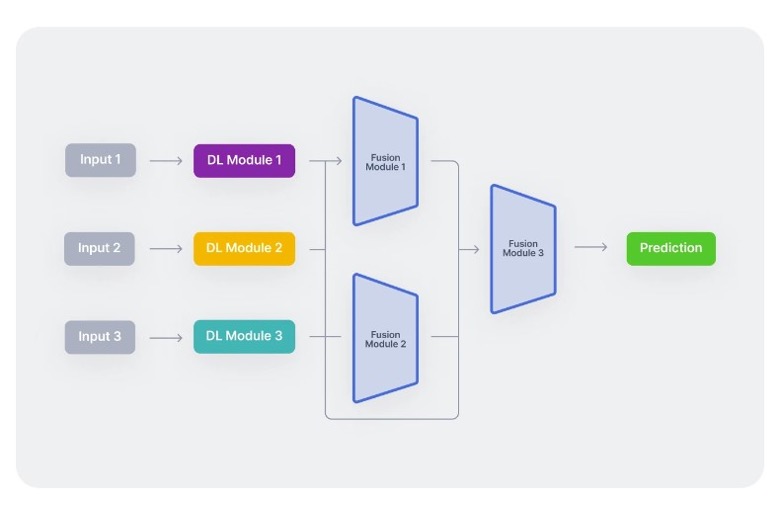 In einem typischen multimodalen Workflow kodieren drei unimodale neuronale Netzwerke zunächst unabhängig voneinander verschiedene Eingabemodalitäten. Nach der Merkmalsextraktion kombiniert ein Fusionsmodul diese Modalitäten – oft werden sie paarweise zusammengeführt. Schließlich werden die integrierten Merkmale in ein Klassifikationsnetzwerk eingespeist, um den endgültigen Entscheidungsprozess durchzuführen.