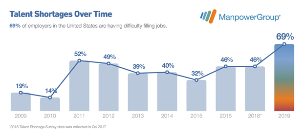 In North America, the United States is suffering from the tech talent crisis the most, with the skills shortage being at a ten-year high. According to the same survey, 69% of employers were struggling to fill positions in 2019, with skilled trades, IT, and sales being the hardest roles to cover.