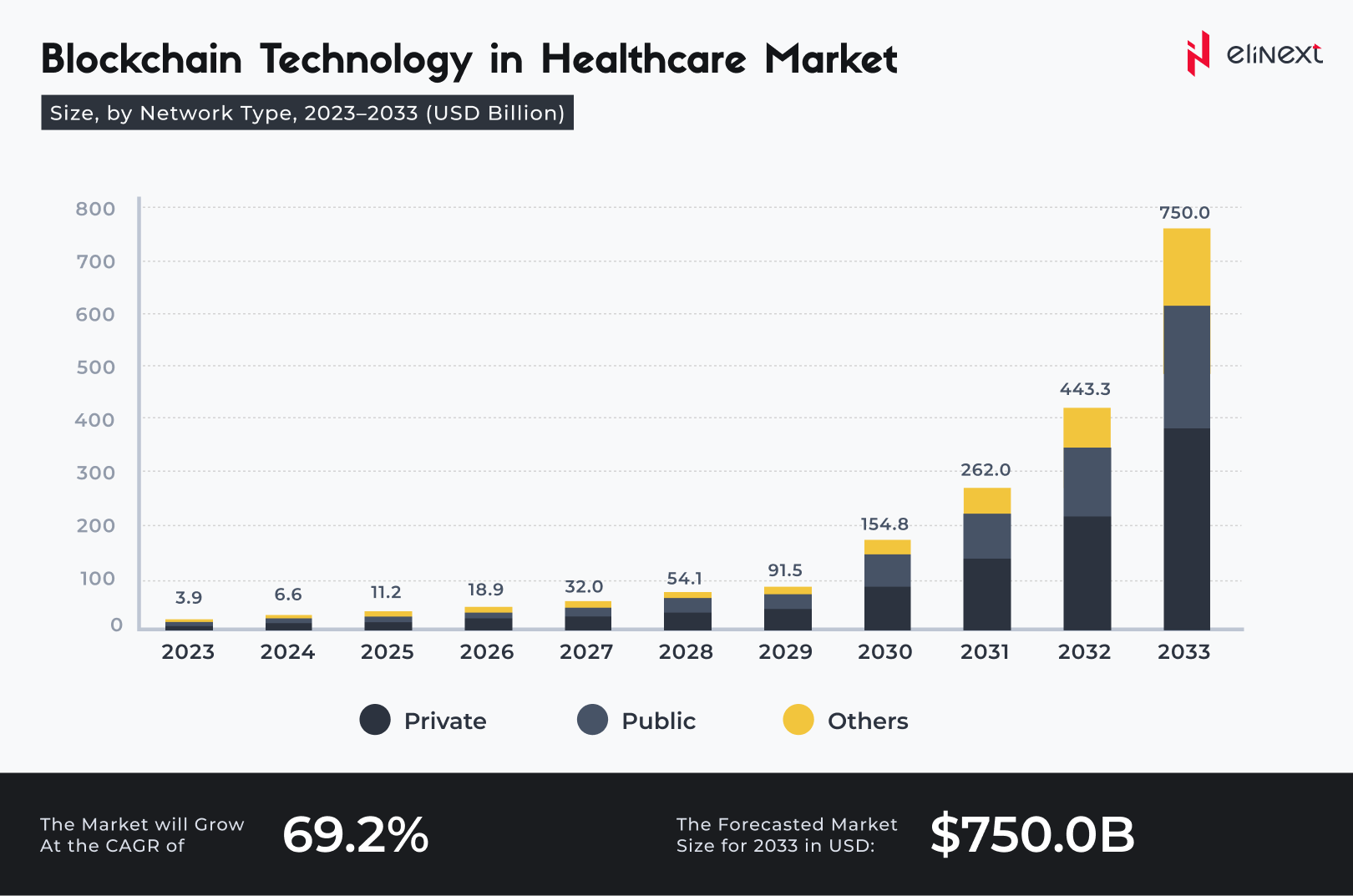 Marktwachstum: Bis 2033 wird erwartet, dass der Blockchain-im-Gesundheitswesen-Markt ein Volumen von 750 Mrd. USD erreicht und jährlich um 69,2 % wächst – deutlich über dem Wert von 3,9 Mrd. USD im Jahr 2023.