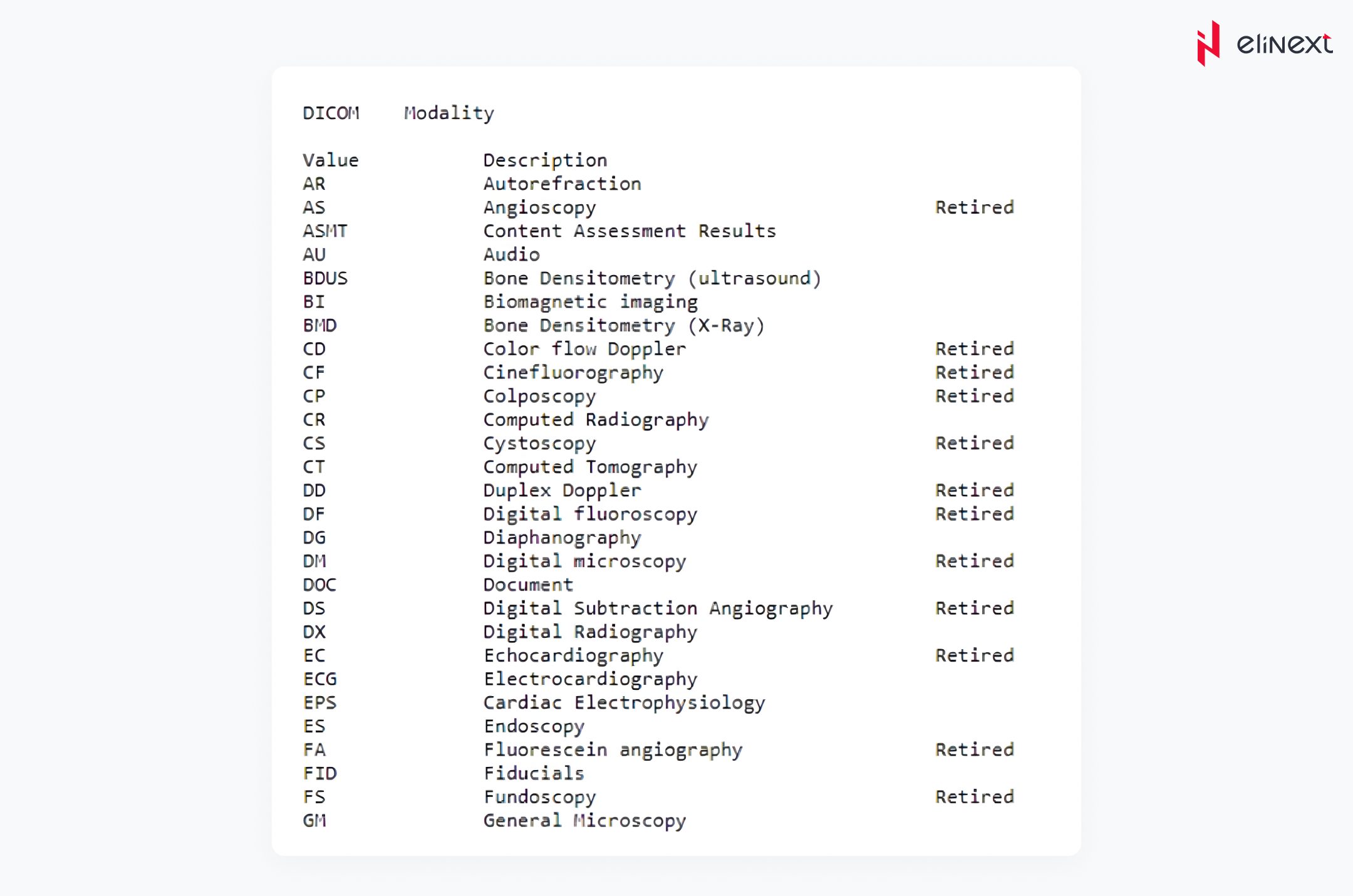 Ein DICOM-Datenobjekt besteht aus einer Gruppe von Attributen, zu denen Elemente wie der Name und die Kennung des Patienten gehören, sowie Attribute, die Informationen über Pixelbilder enthalten. Eines dieser Attribute ist die Modalität, die den Dateityp repräsentiert. Man kann es auch als den Typ des Geräts betrachten, das verwendet wurde, um die Datei zu erhalten. DICOM legt eine funktionale Liste von Modalitäten fest.