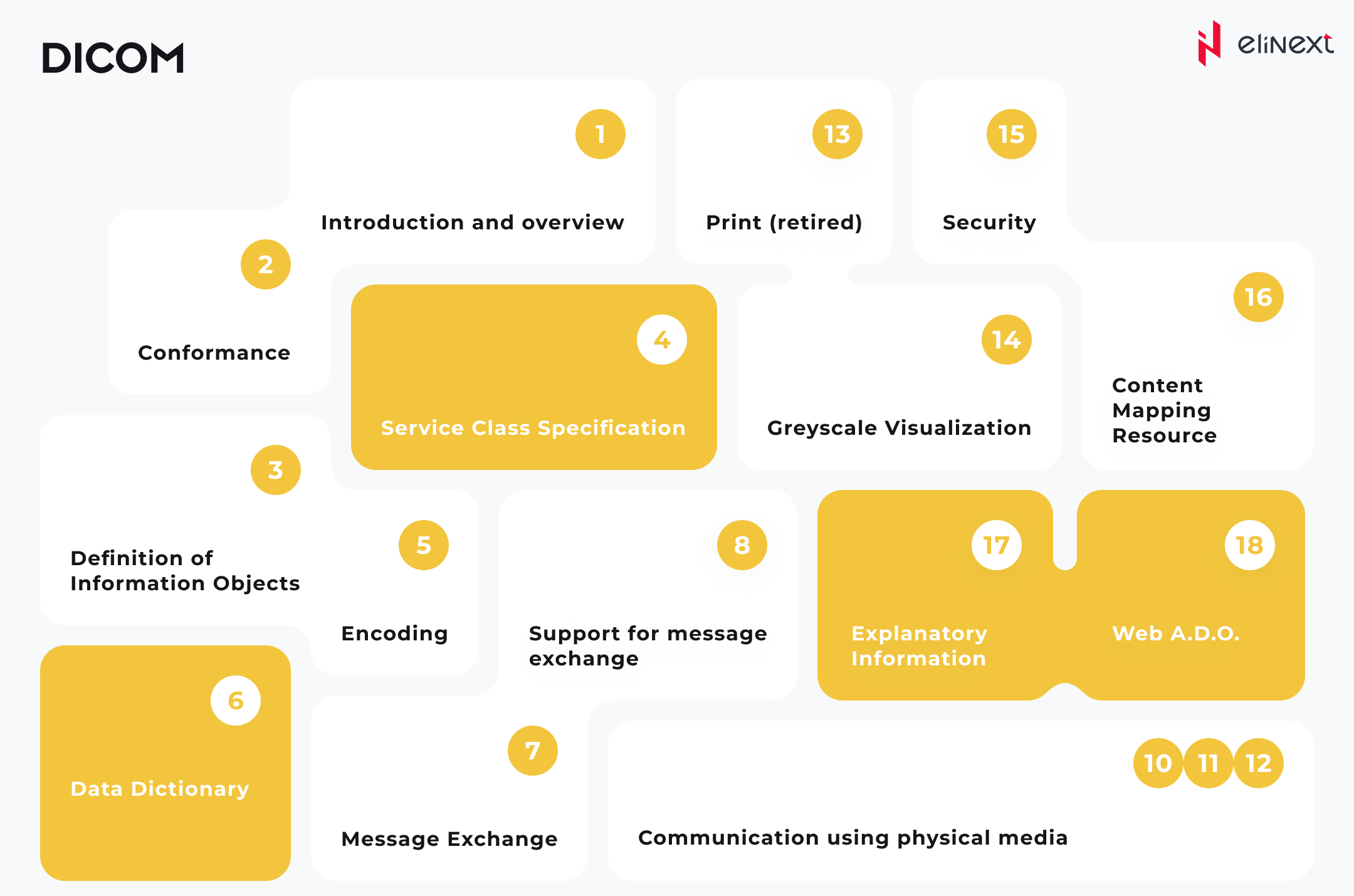 DICOM Format definiert nicht nur Bild- und Datensätze; es umfasst auch das Transportprotokoll und verschiedene andere Dienste. Aktuell besteht der gesamte Standard aus 22 miteinander verbundenen, aber eigenständigen Abschnitten. Beispielsweise gibt es Abschnitte, die Folgendes umfassen: