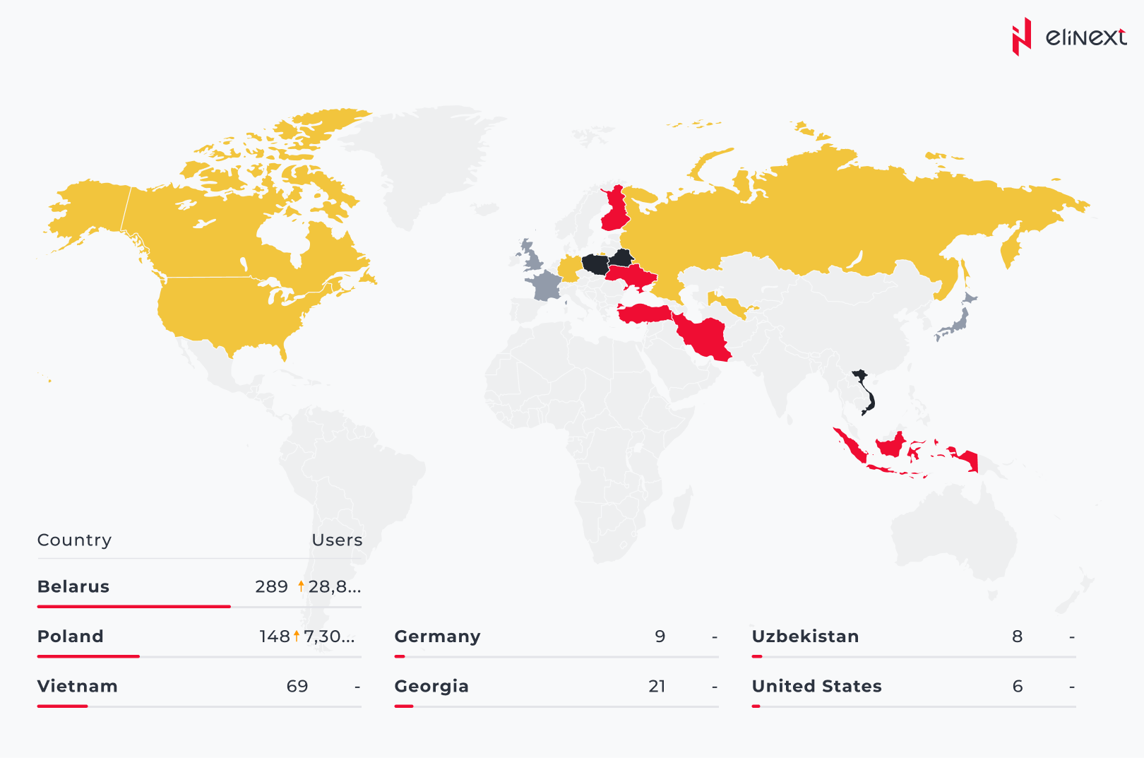 Die geografischen Standorte unserer Nutzer sind recht vielfältig, aber vier Standorte dominieren: Weißrussland, Polen, Vietnam und Georgien.